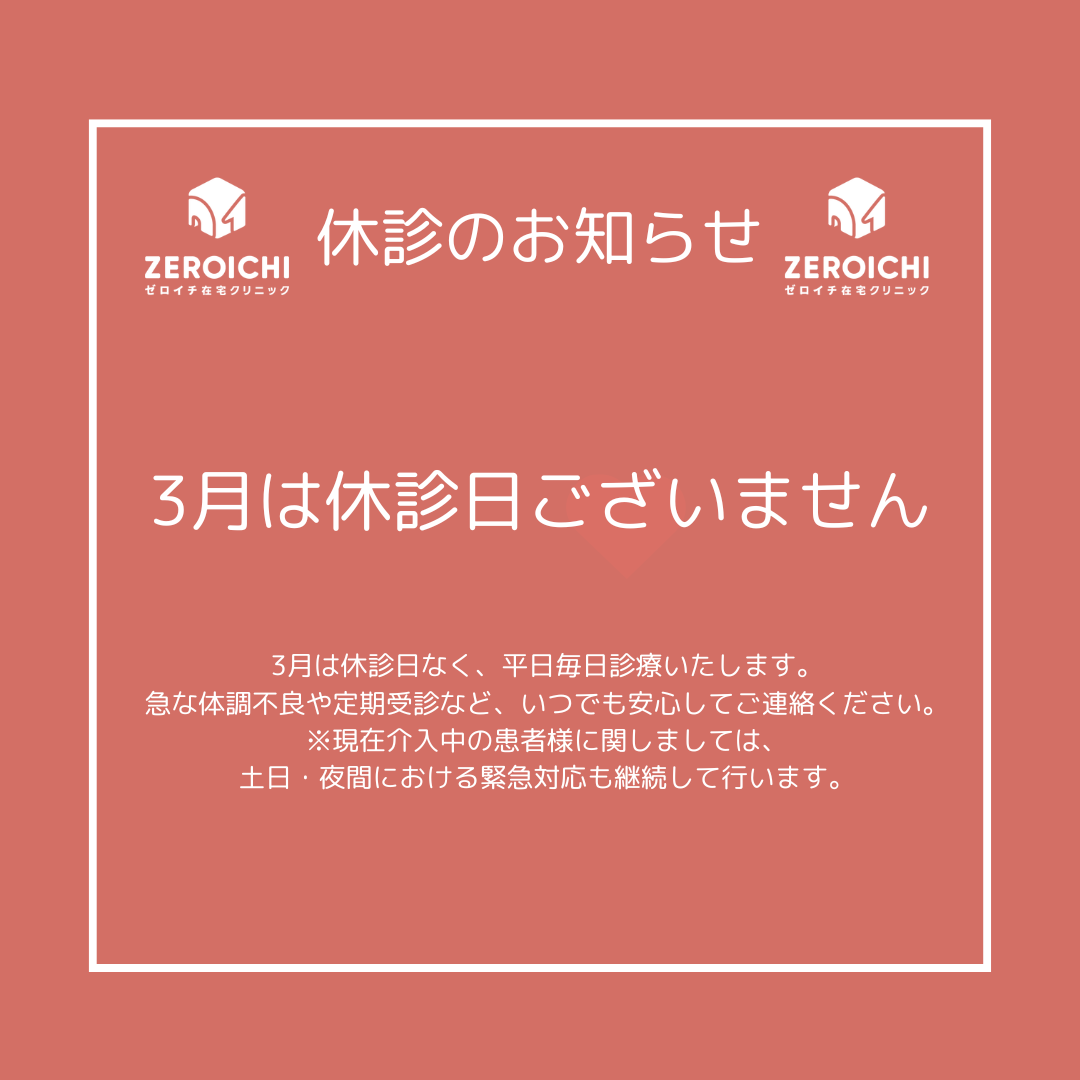 今月、ゼロイチ在宅クリニックでは特定の休診日は設けず、平日(月曜日〜金曜日)は毎日通常通り診療を行っております。